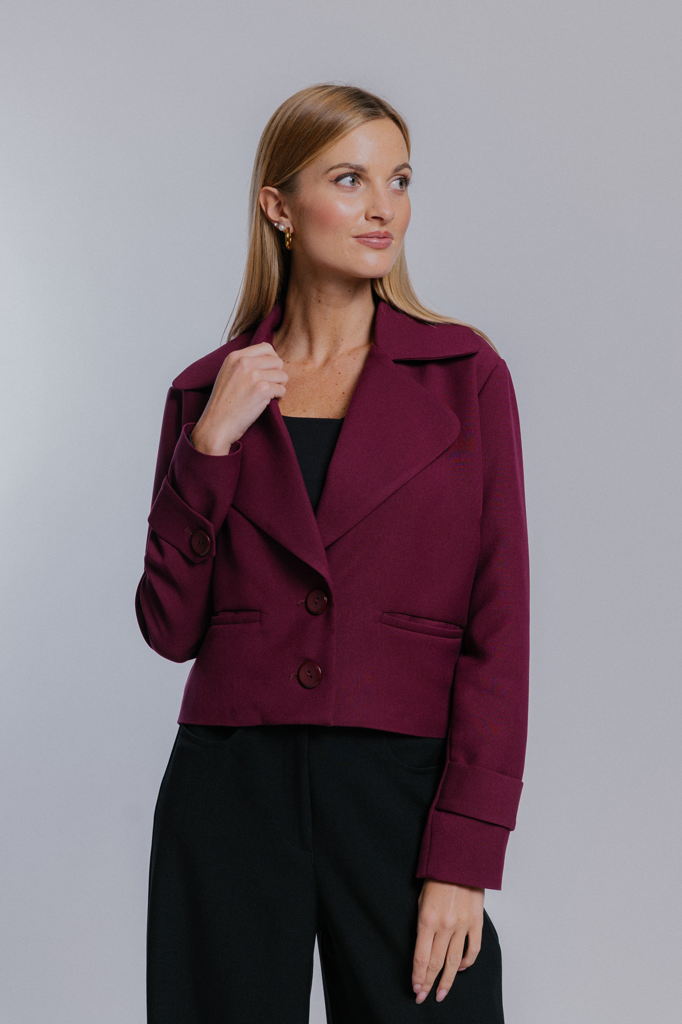 Krátké sako s klopami a dlouhým rukávem.