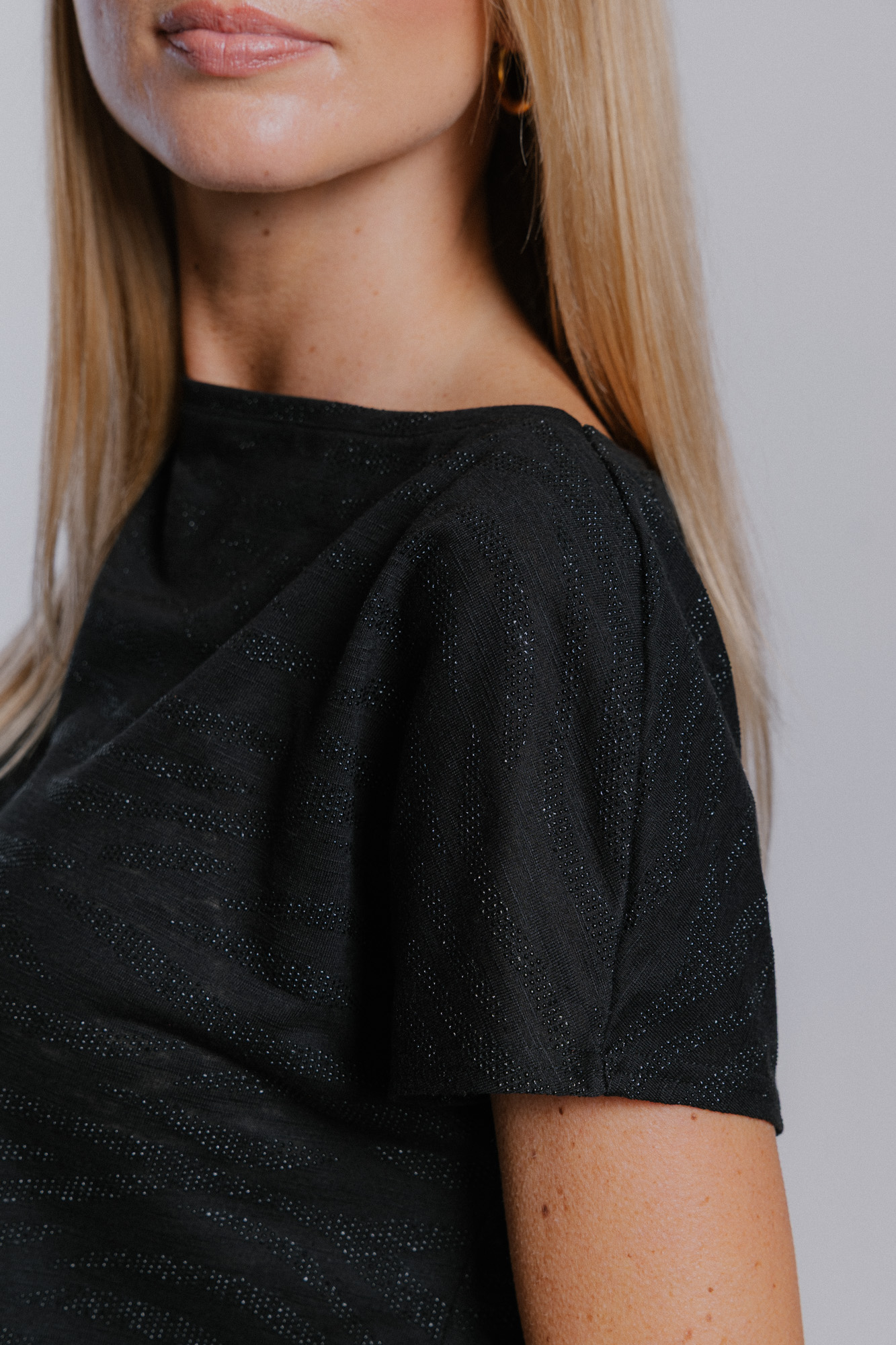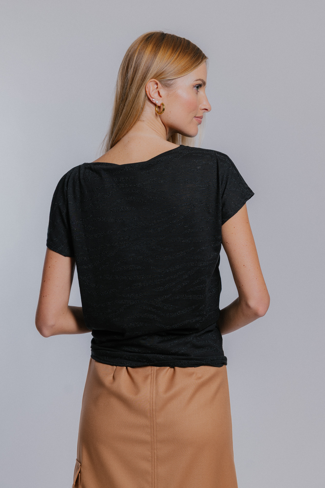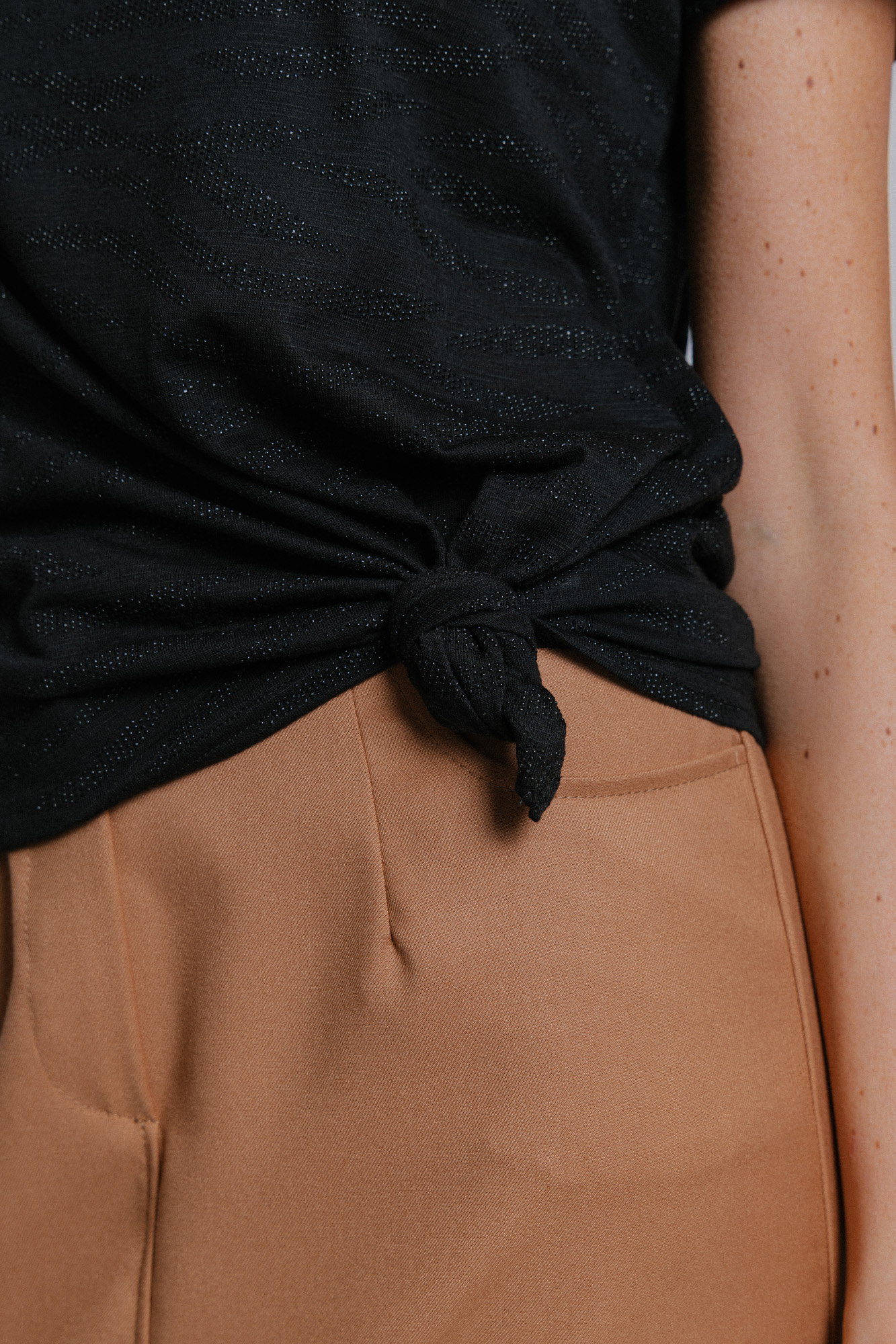 Míry modelky: prsa 89 cm; pas 60 cm; boky 85 cm; výška 175 cm. Modelka má na sobě velikost S.