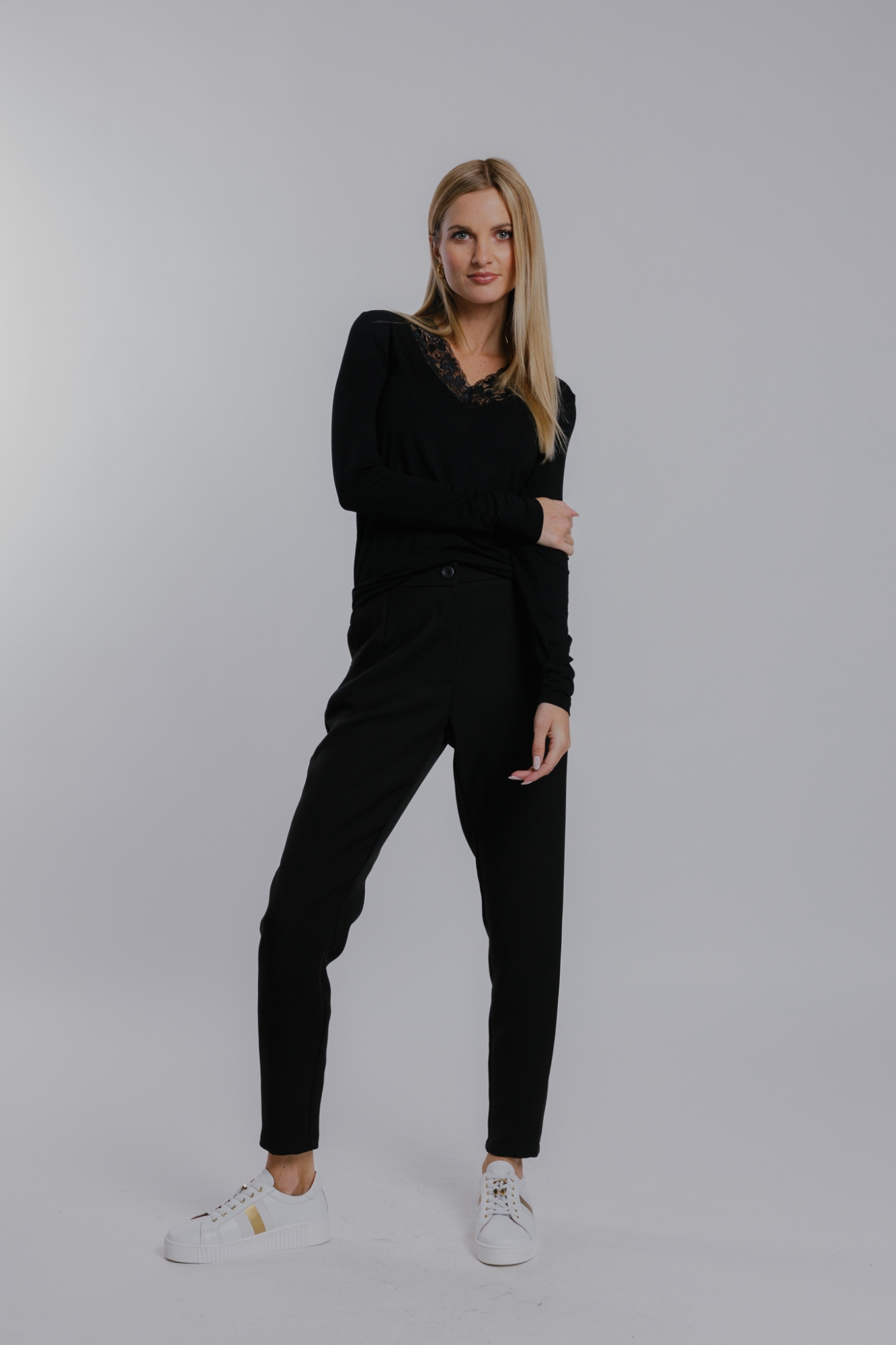 Míry modelky: prsa 85 cm; pas 65 cm; boky 95 cm; výška 177 cm. Modelka má na sobě velikost S.