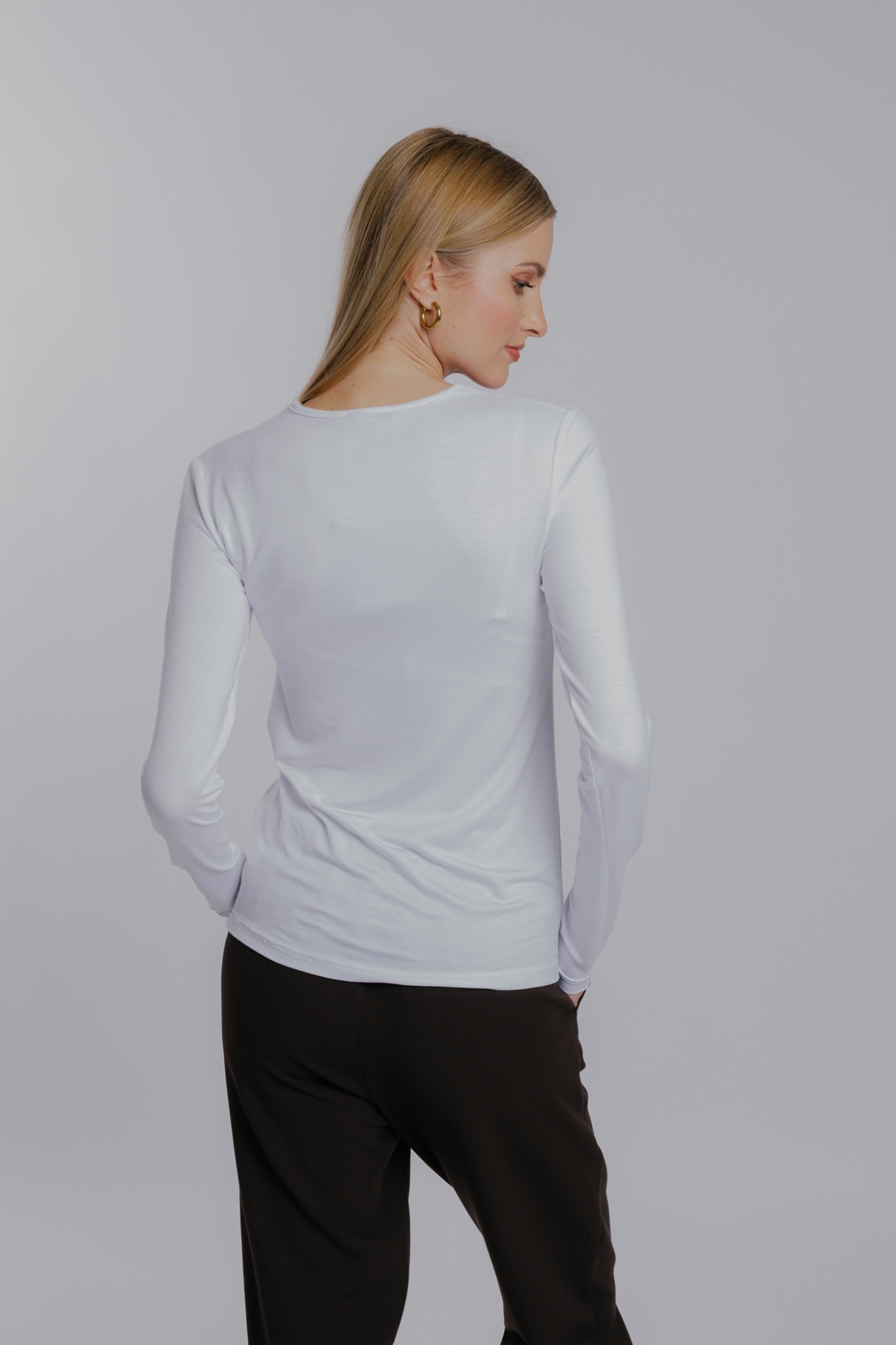 Míry modelky: prsa 89 cm; pas 60 cm; boky 85 cm; výška 175 cm. Modelka má na sobě velikost S.
