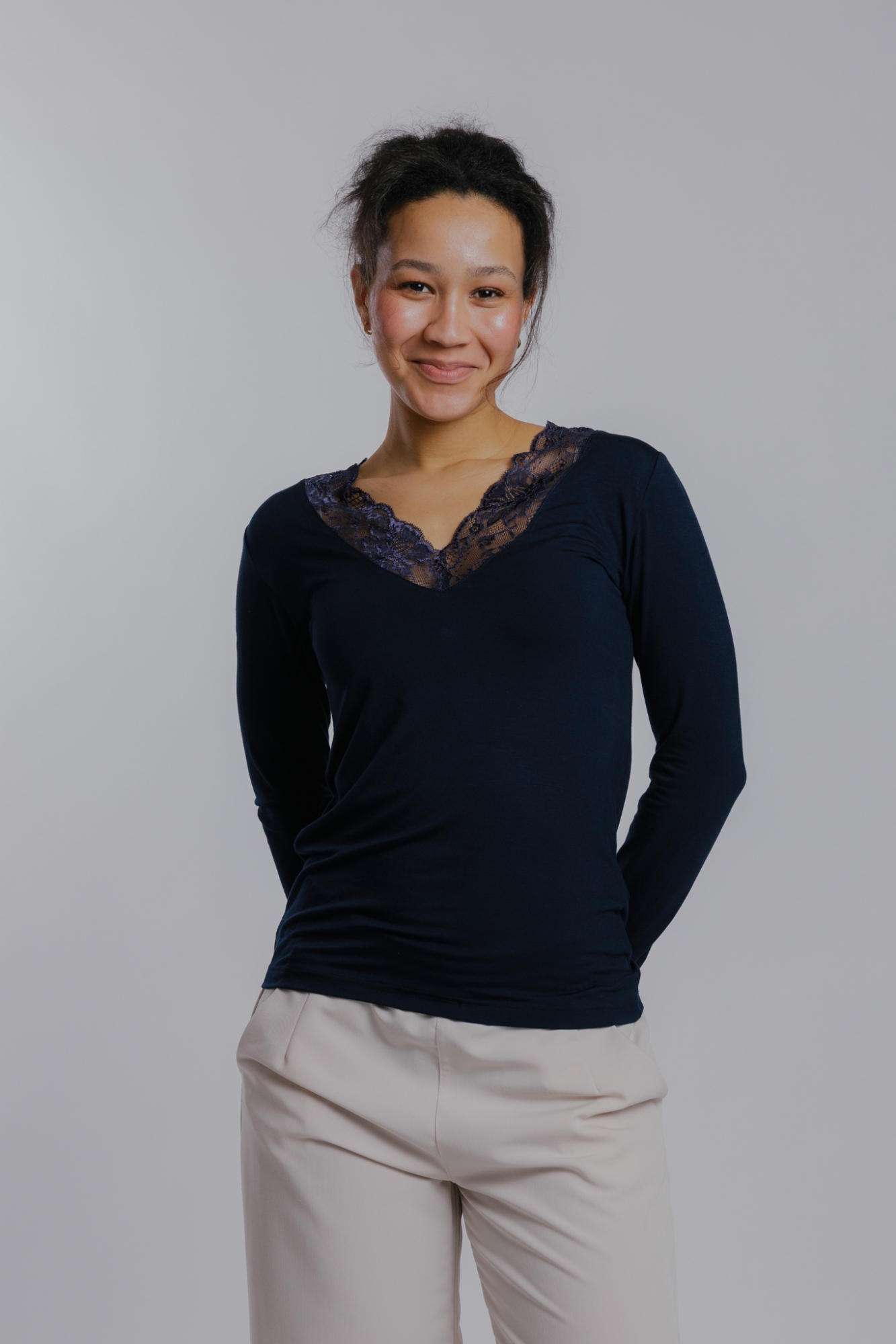 Míry modelky: prsa 85 cm; pas 65 cm; boky 95 cm; výška 173 cm. Modelka má na sobě velikost S