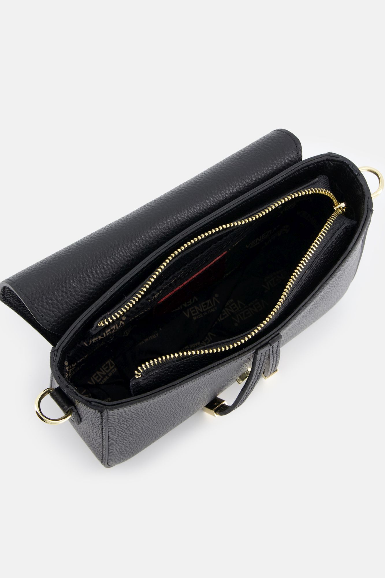 Černá kožená kabelka přes rameno s asymetrickou klopou