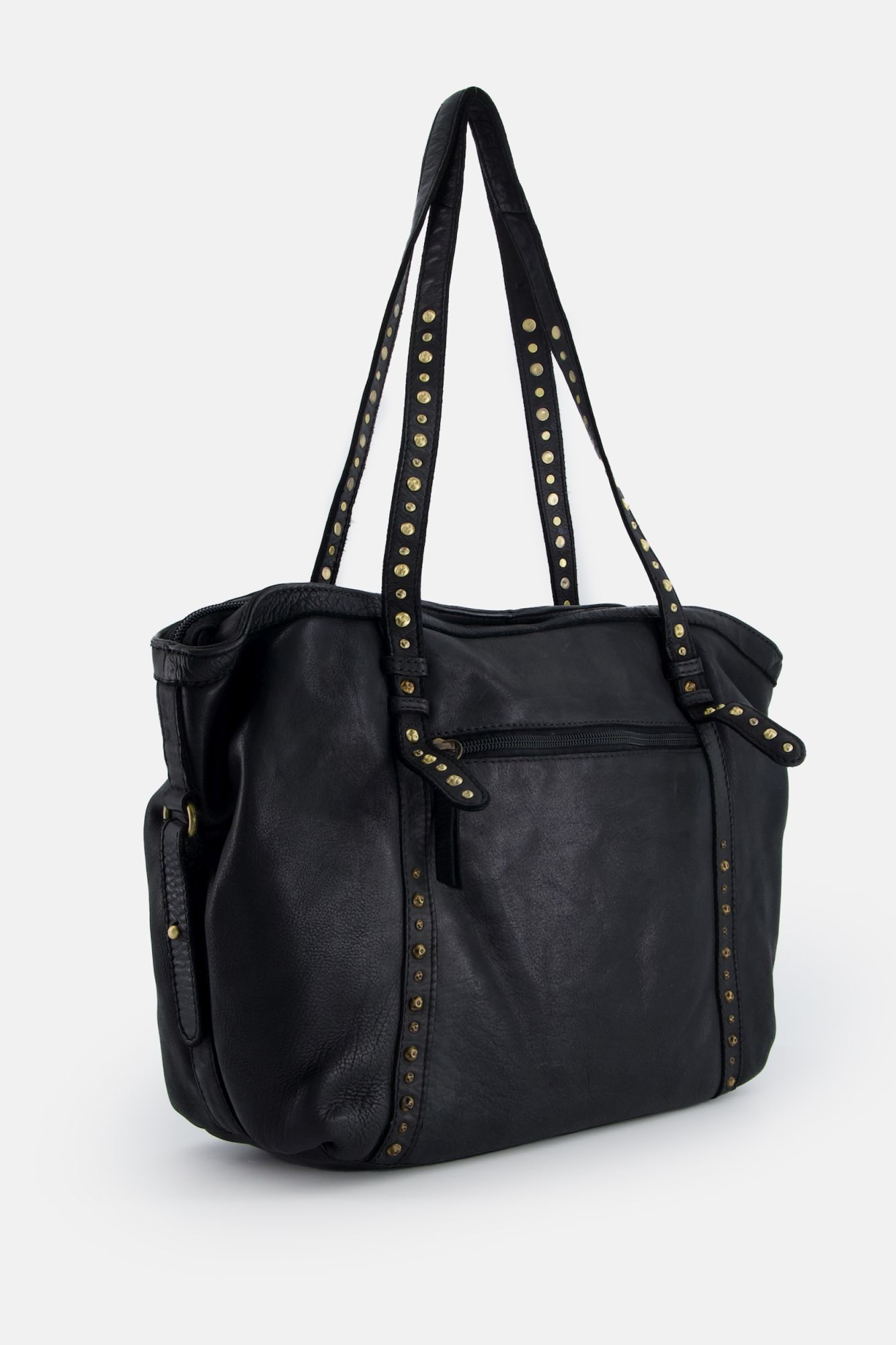 Černá kožená kabelka s ozdobnými nýty a kapsami