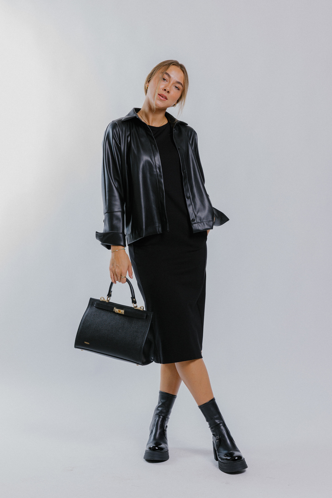 Míry modelky: prsa 85 cm; pas 65 cm; boky 95 cm; výška 177 cm. Modelka má na sobě velikost S.