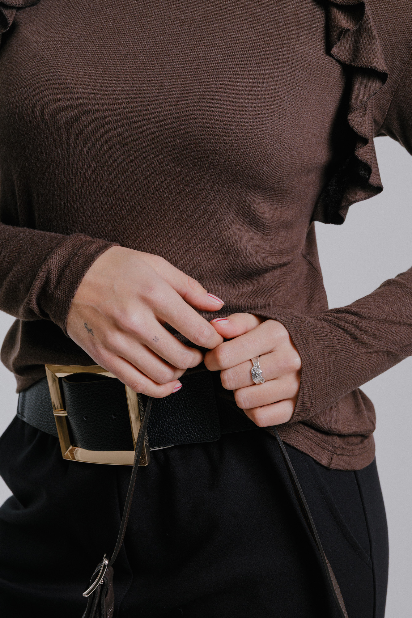 Míry modelky: prsa 85 cm; pas 65 cm; boky 92 cm; výška 174 cm. Modelka má na sobě velikost S.