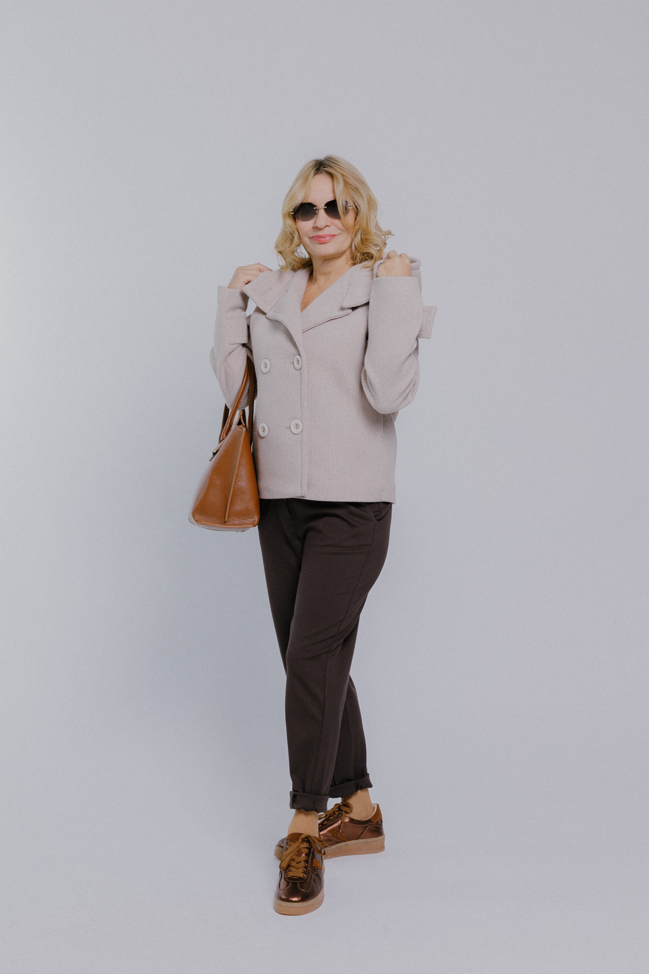 Míry modelky: prsa 90 cm; pas 70 cm; boky 95 cm; výška 165 cm. Modelka má na sobě velikost S