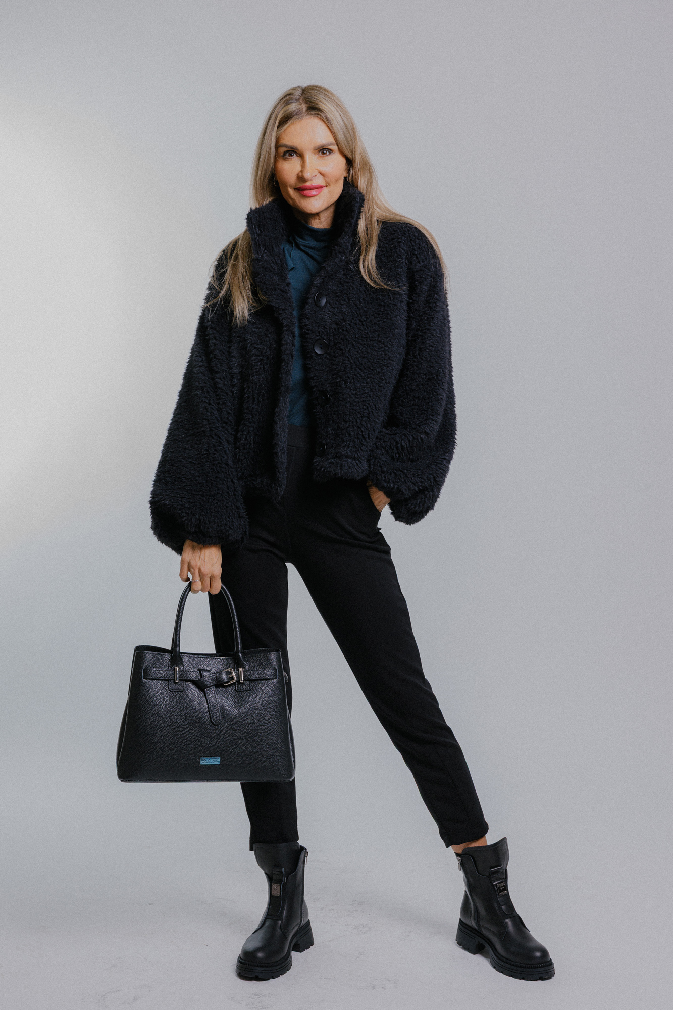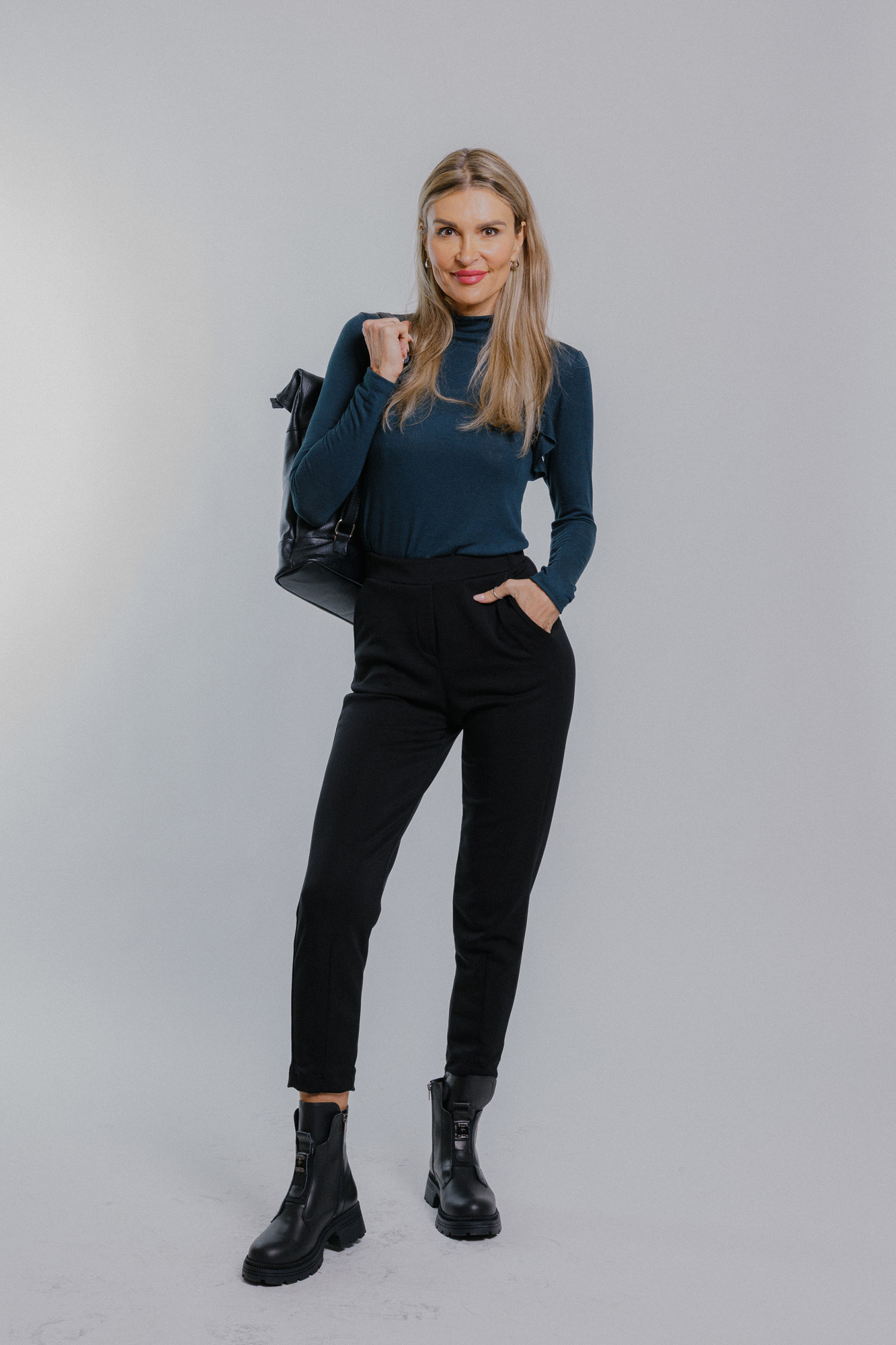 Míry modelky: prsa 92 cm; pas 60 cm; boky 86 cm; výška 183 cm. Modelka má na sobě velikost S.