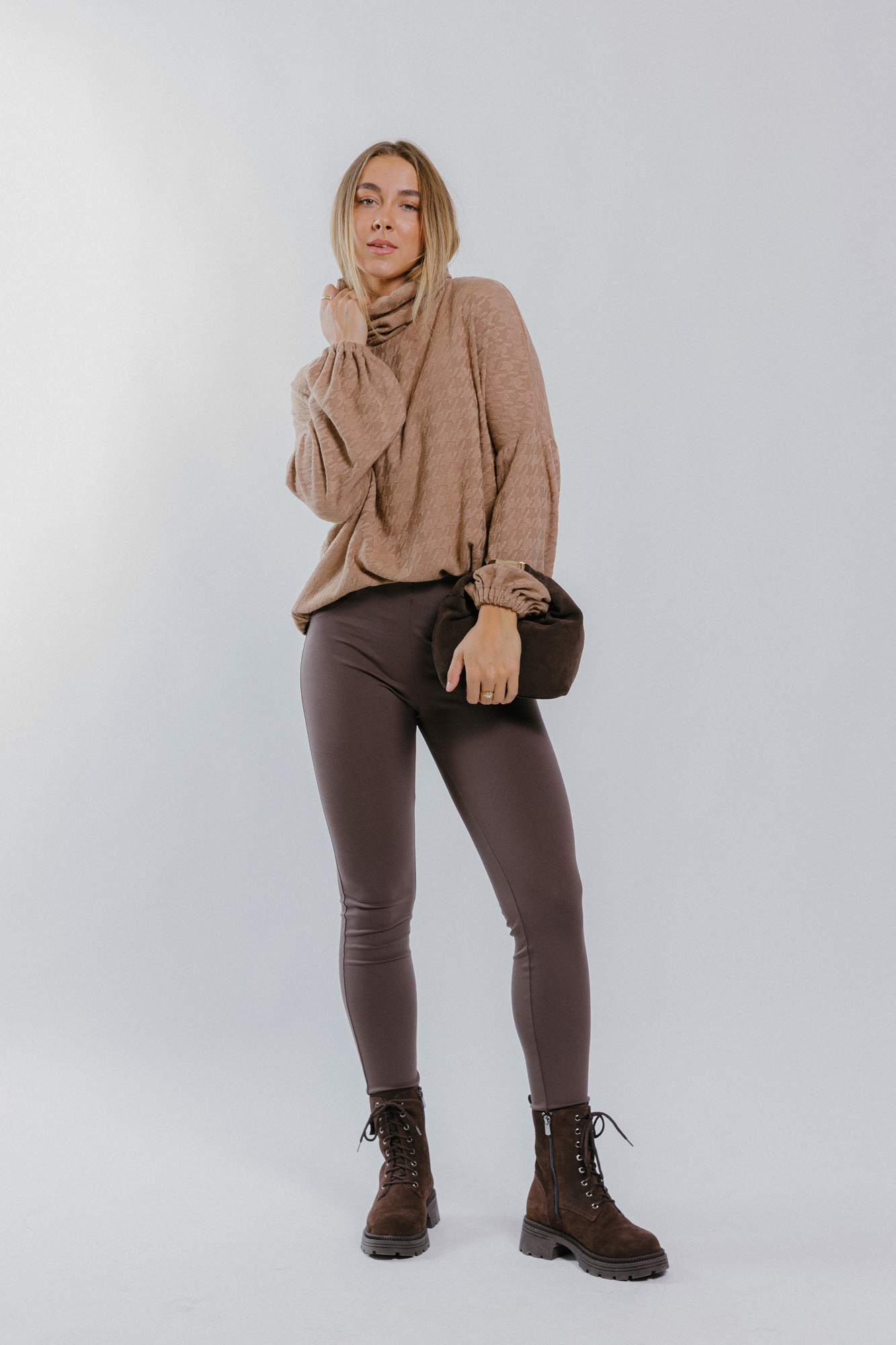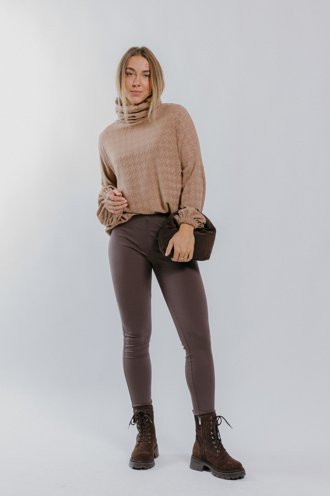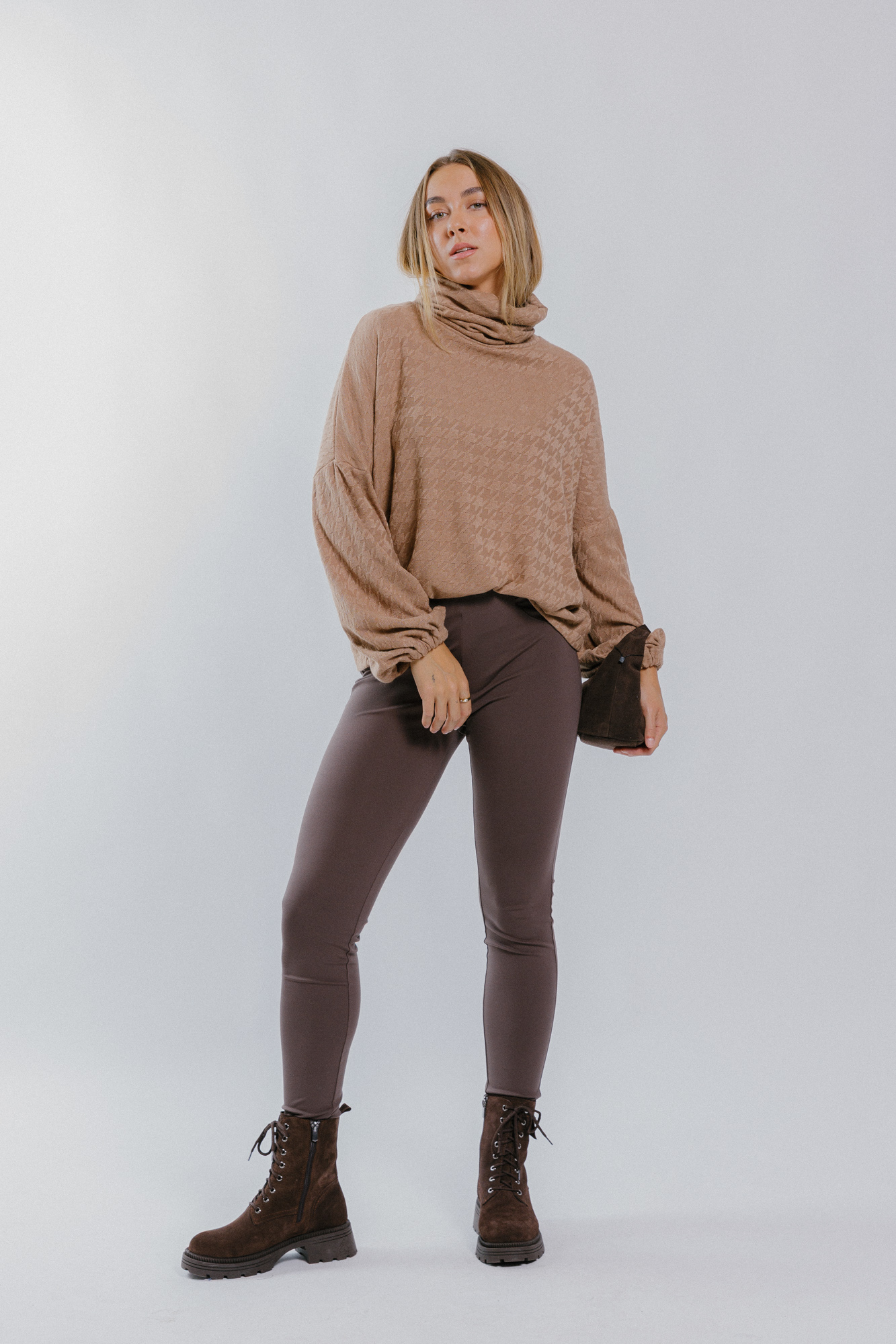 Míry modelky: prsa 85 cm; pas 65 cm; boky 95 cm; výška 177 cm. Modelka má na sobě velikost S.