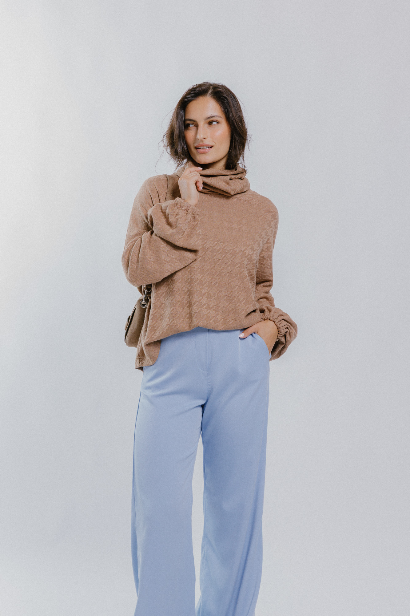 Míry modelky: prsa 89 cm; pas 60 cm; boky 85 cm; výška 175 cm. Modelka má na sobě velikost S.