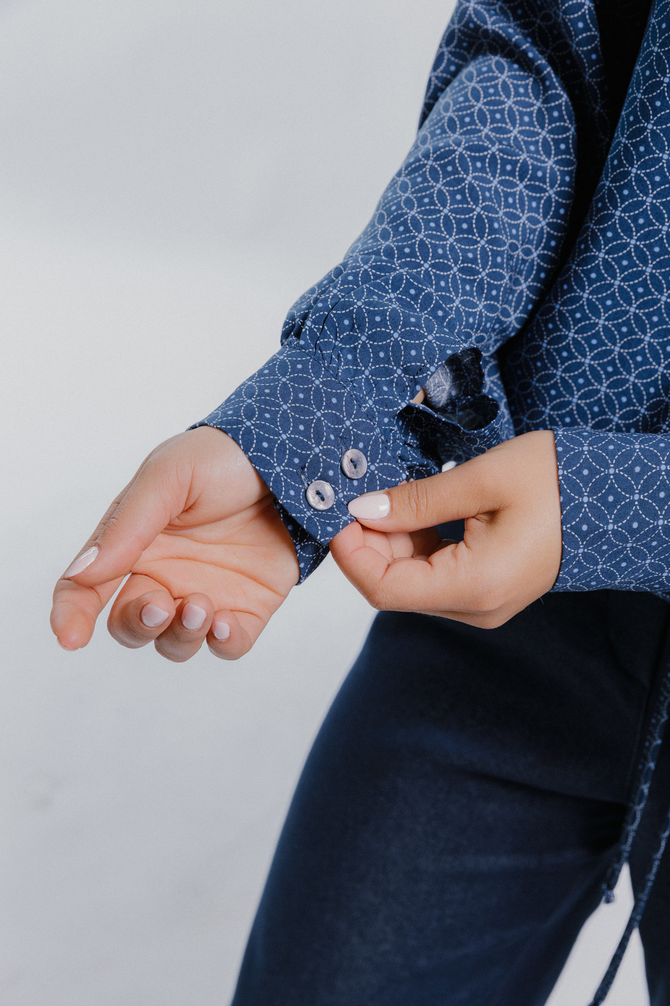 Míry modelky: prsa 85 cm; pas 65 cm; boky 92 cm; výška 169 cm. Modelka má na sobě velikost XS.
