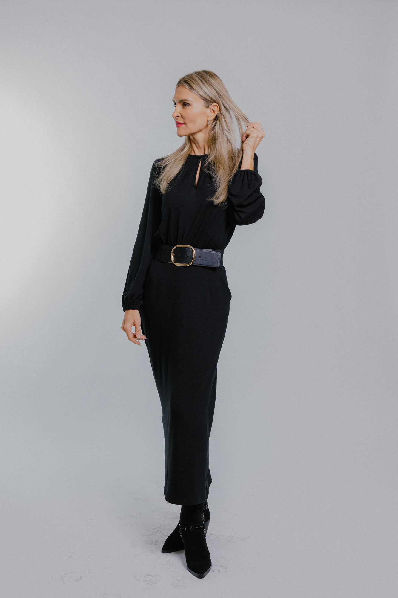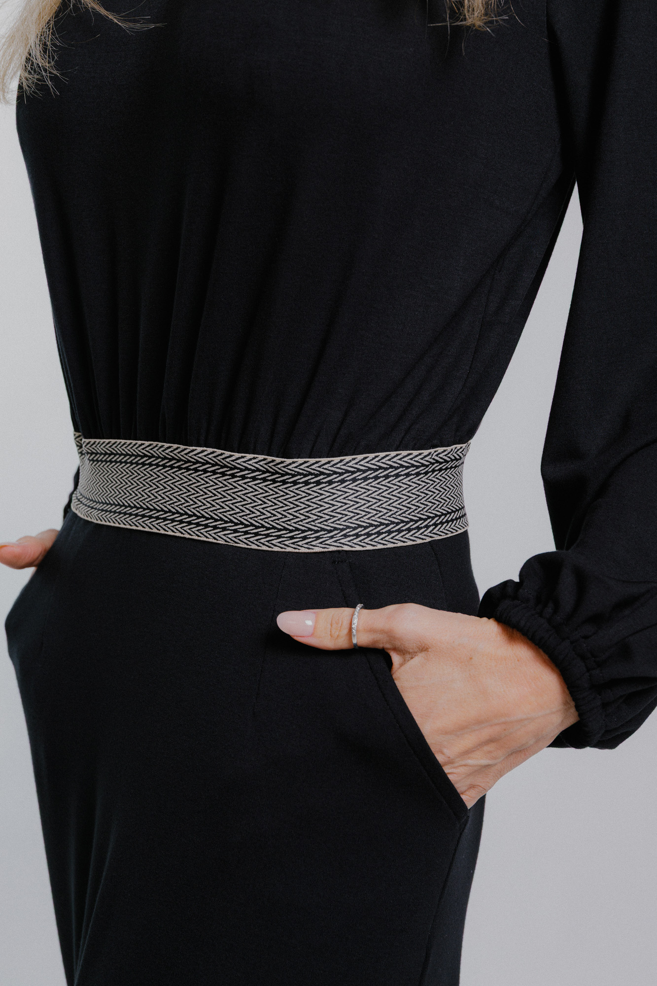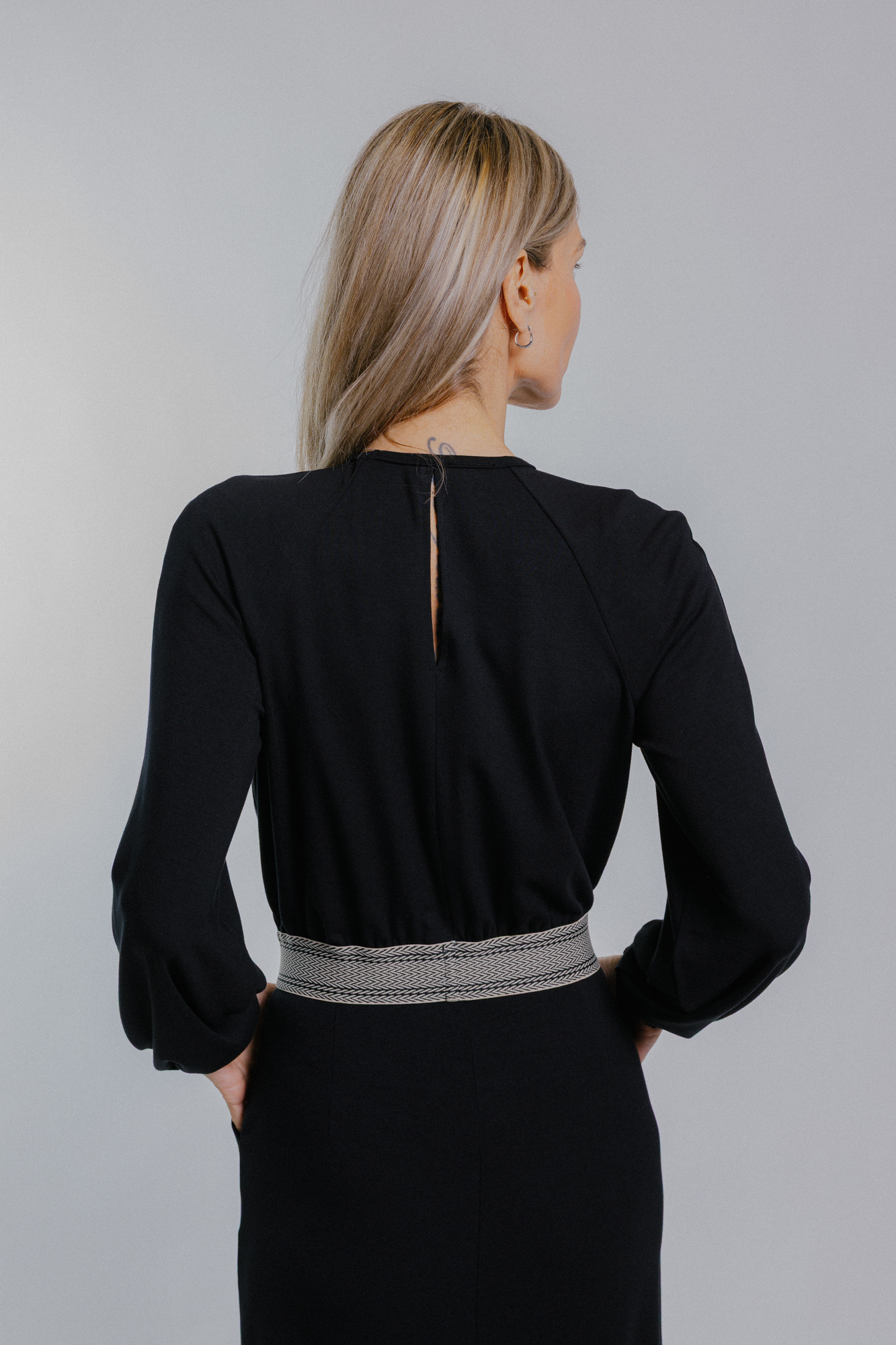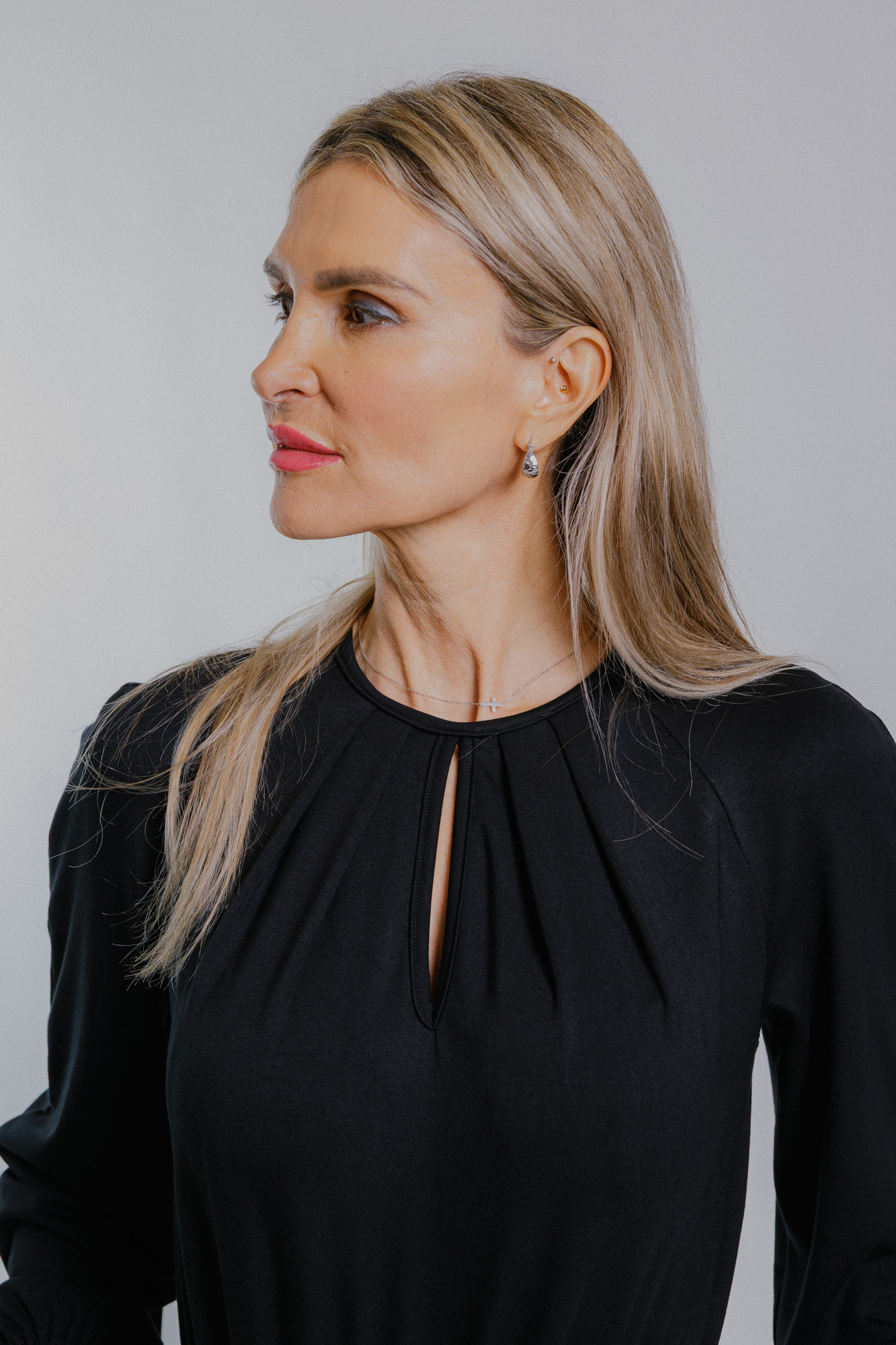 Míry modelky: prsa 92 cm; pas 60 cm; boky 86 cm; výška 183 cm. Modelka má na sobě velikost S.