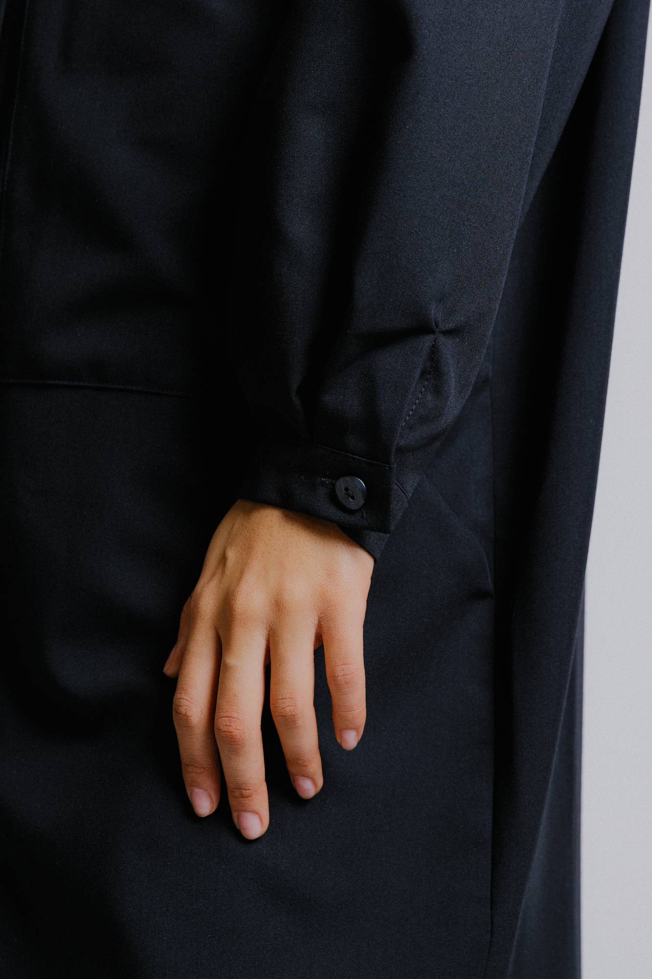 Košilový střih s knofílky na propínání.