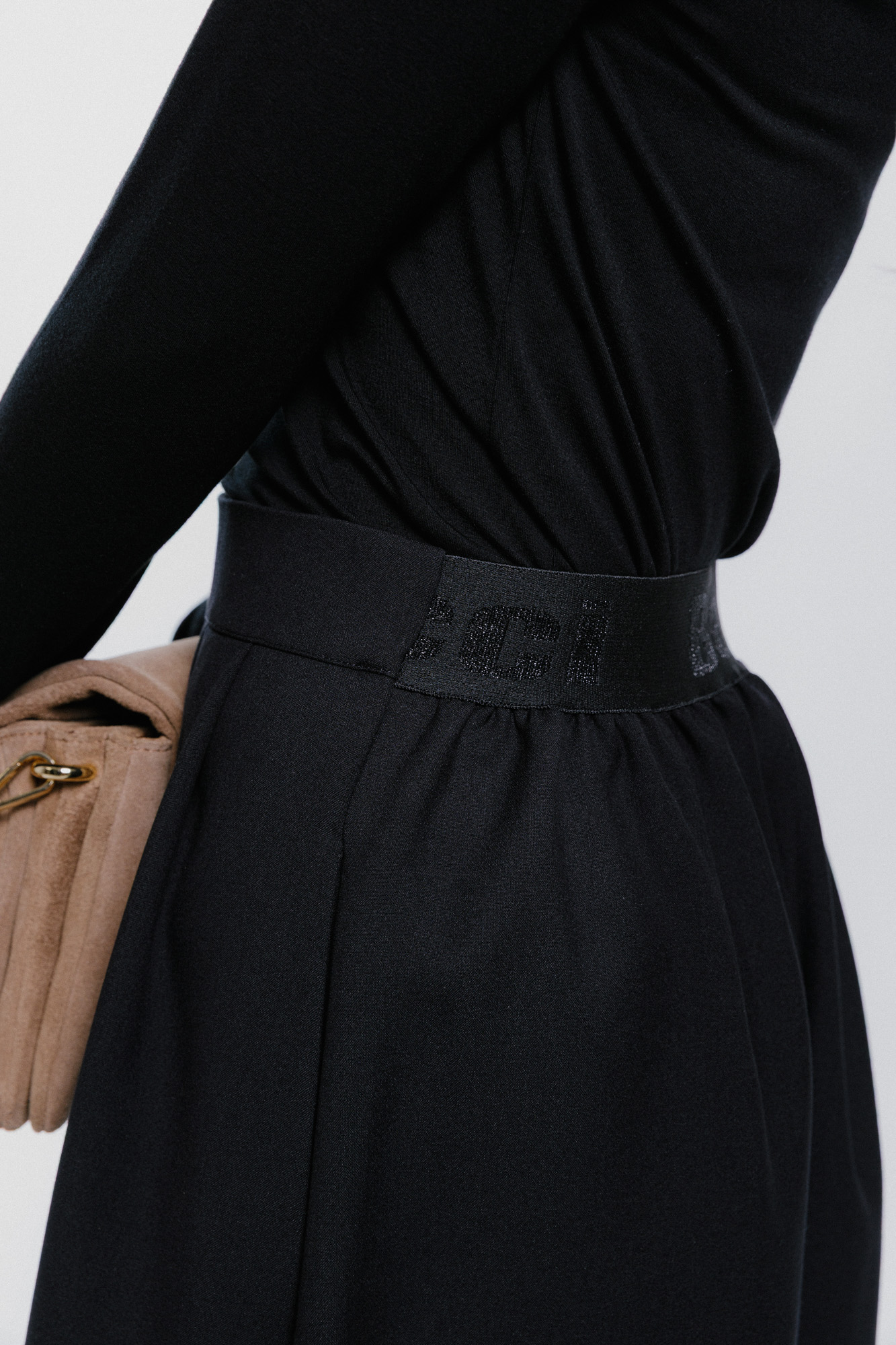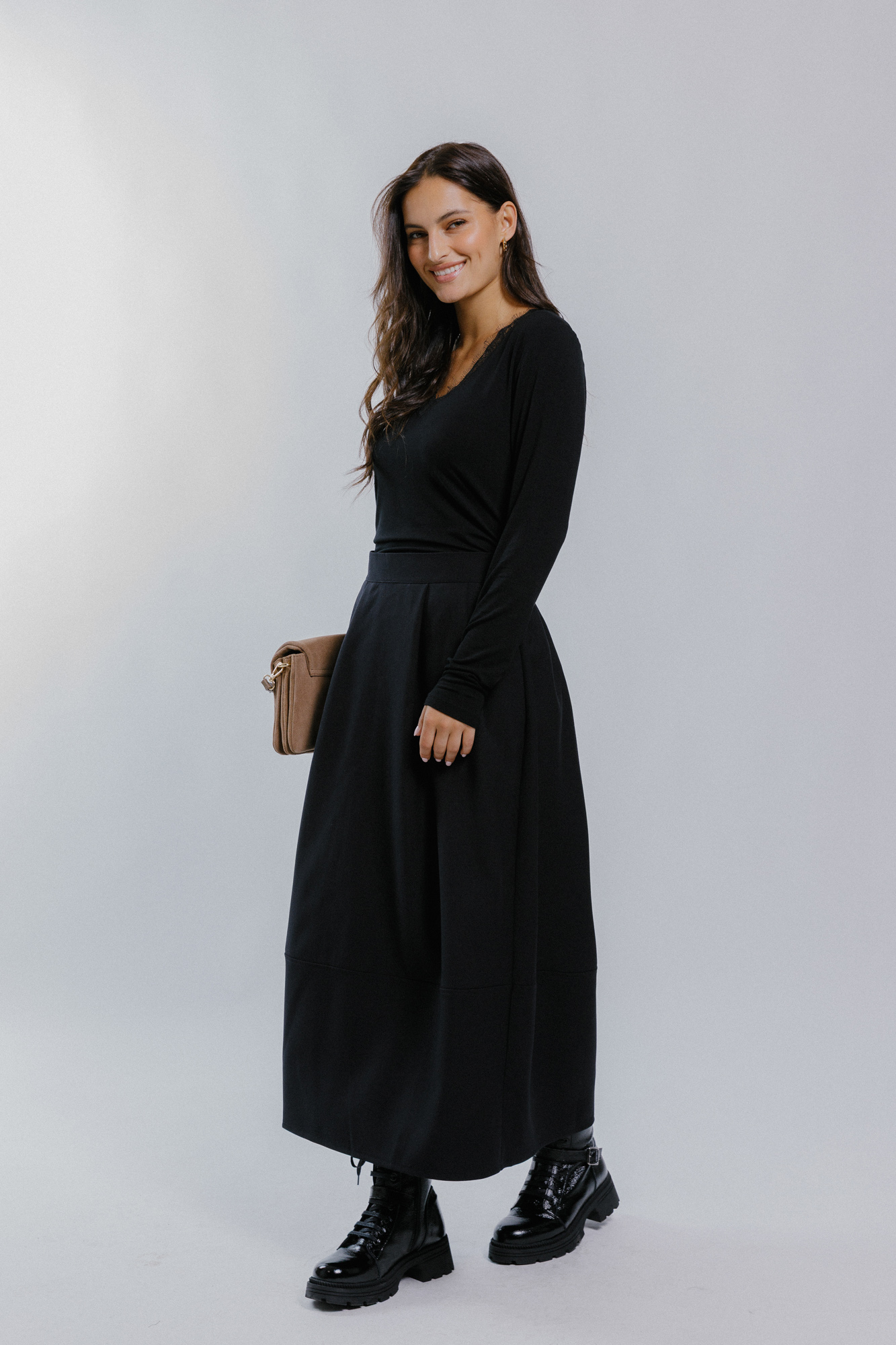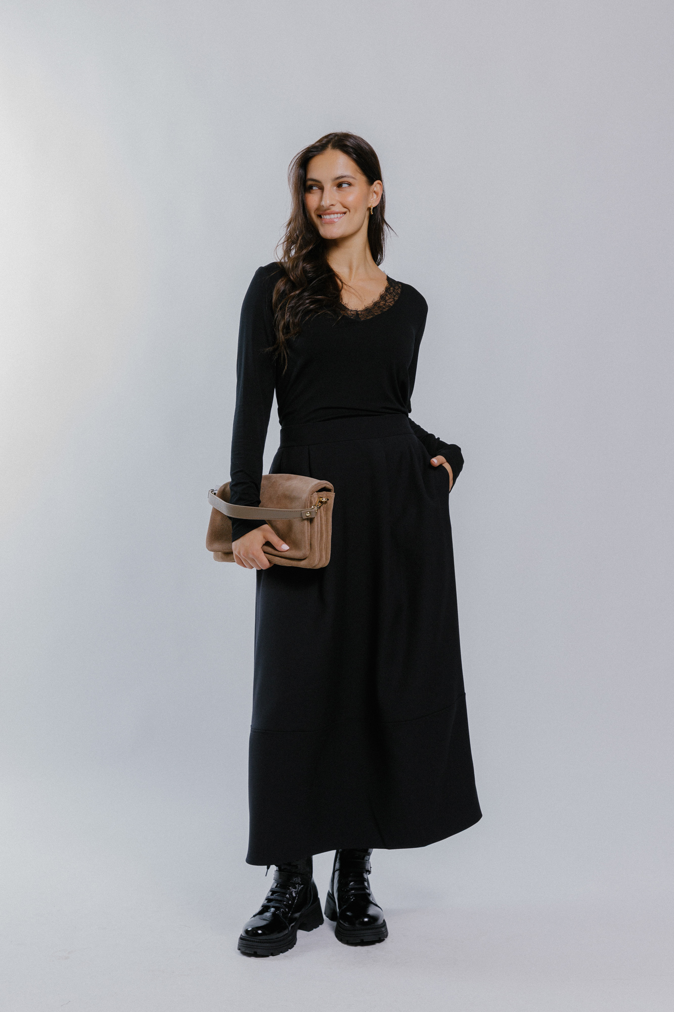 Míry modelky: prsa 85 cm; pas 65 cm; boky 92 cm; výška 169 cm. Modelka má na sobě velikost XS.