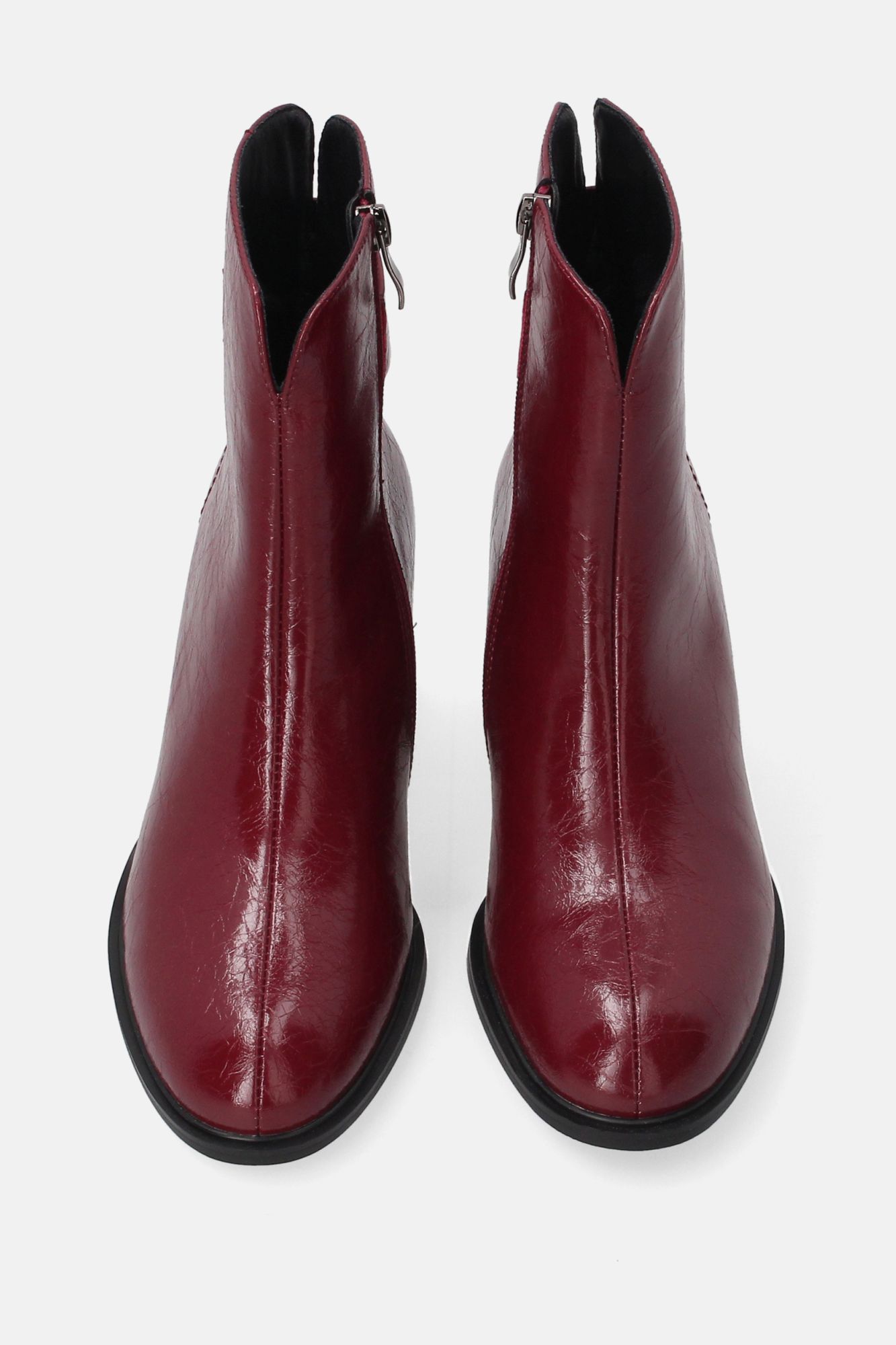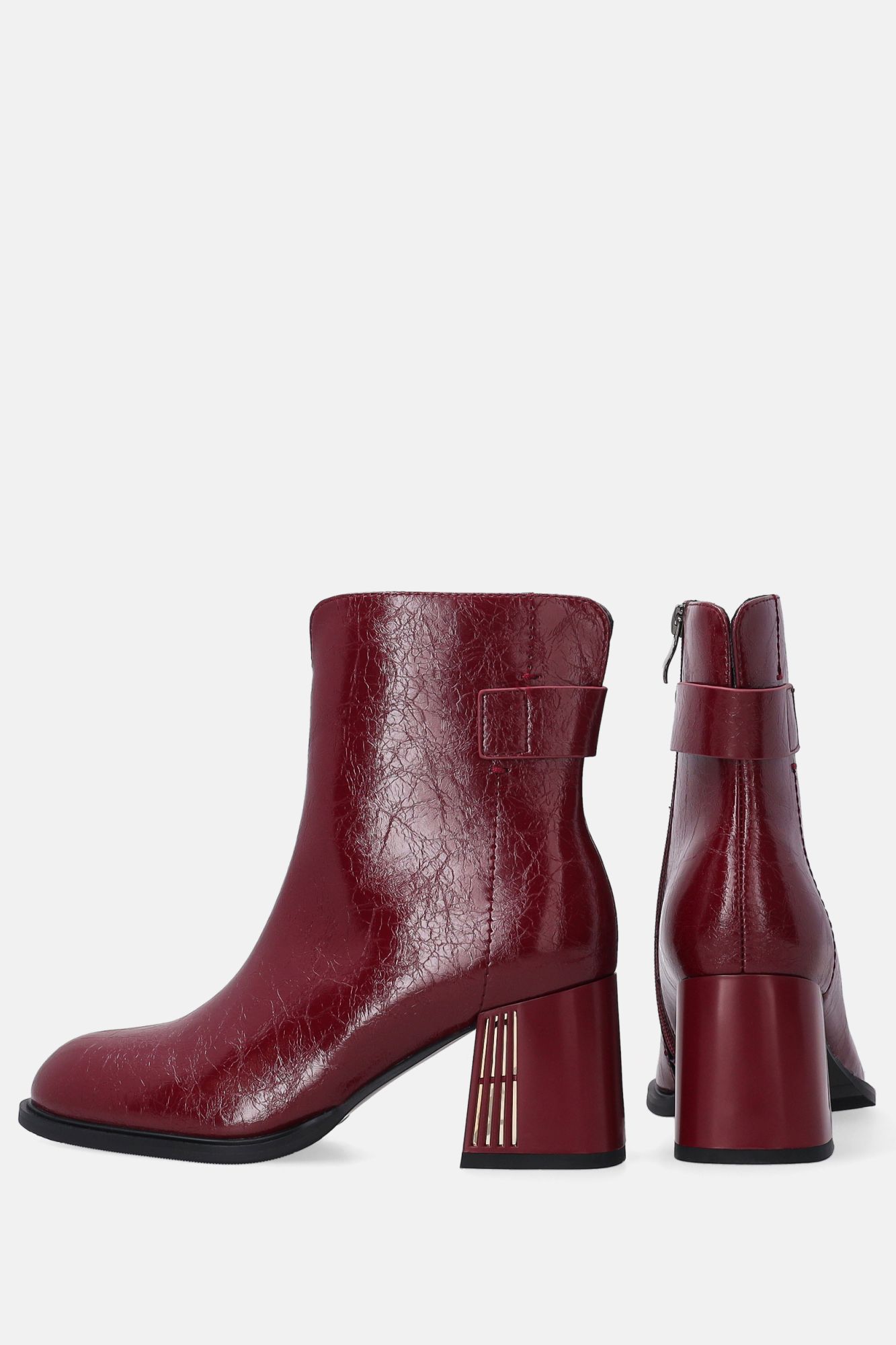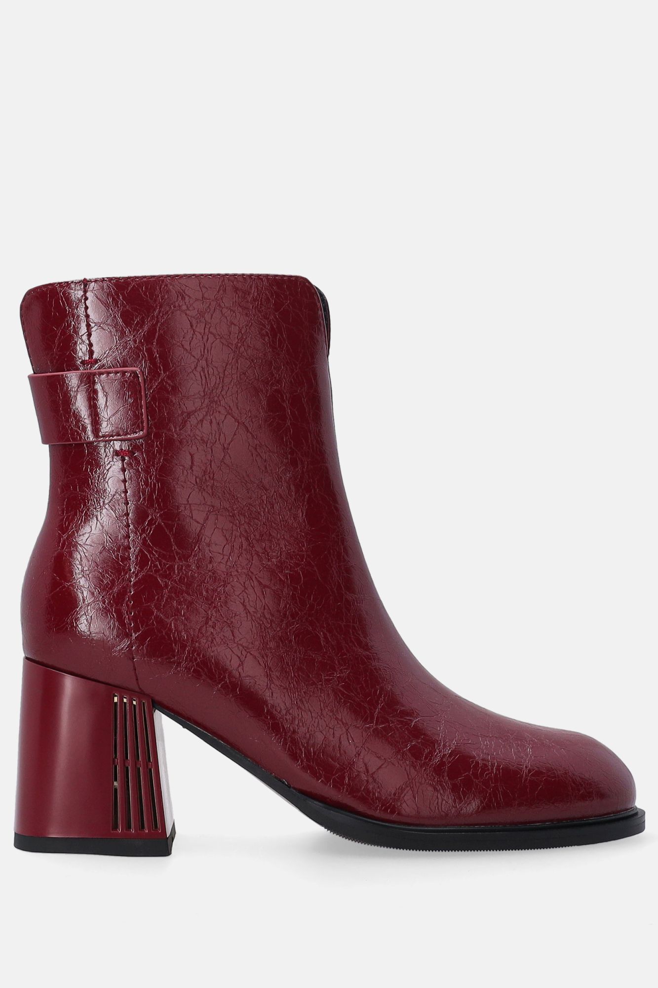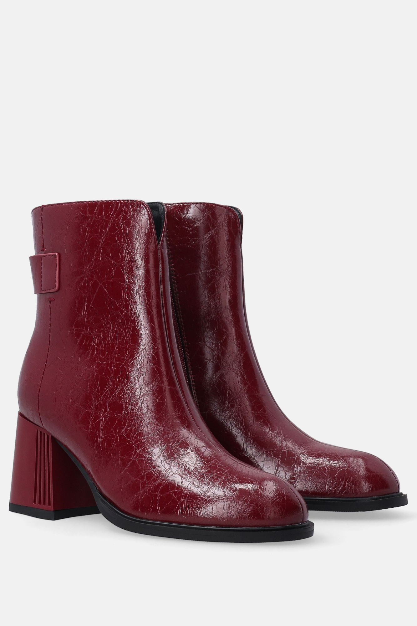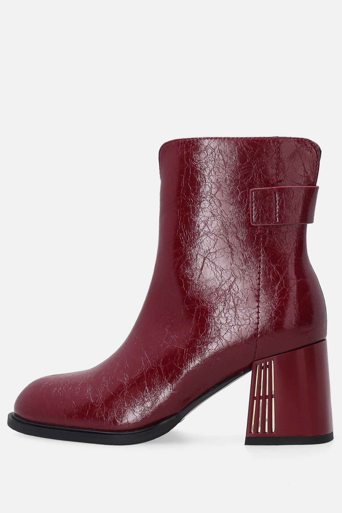 Červené lakované kotníkové boty s ozdobným podpatkem