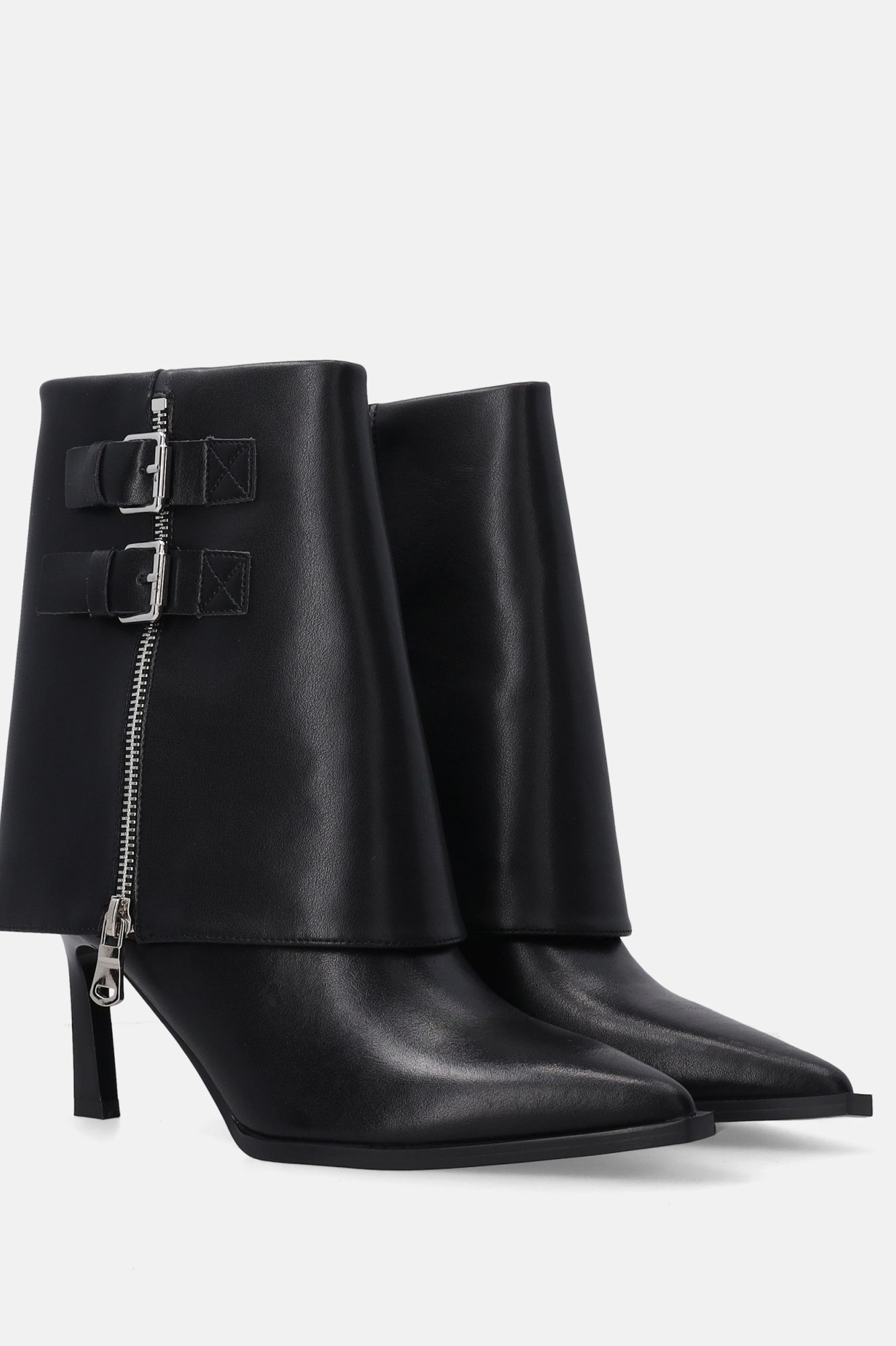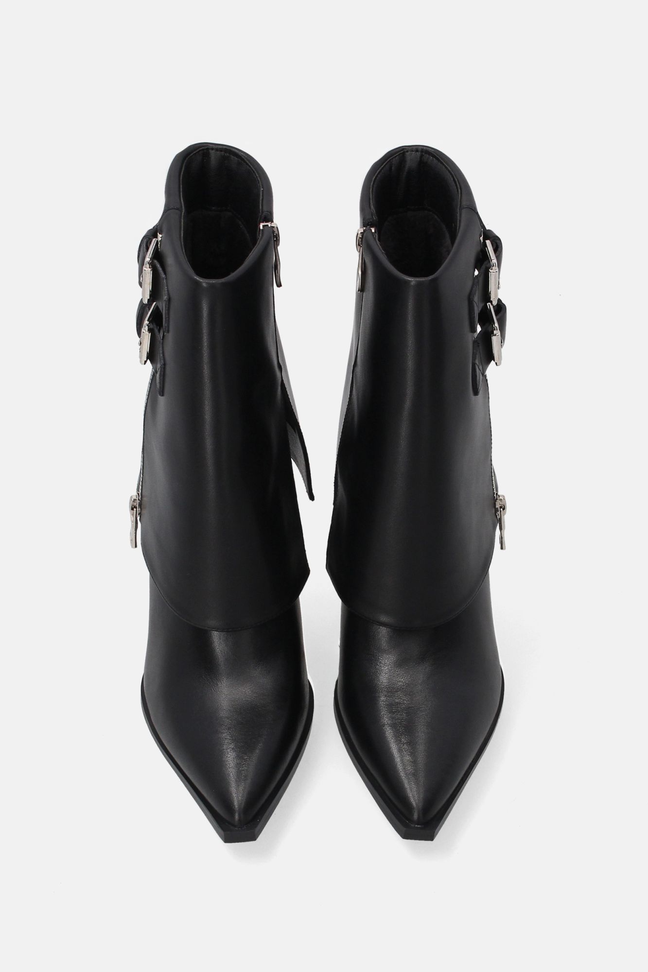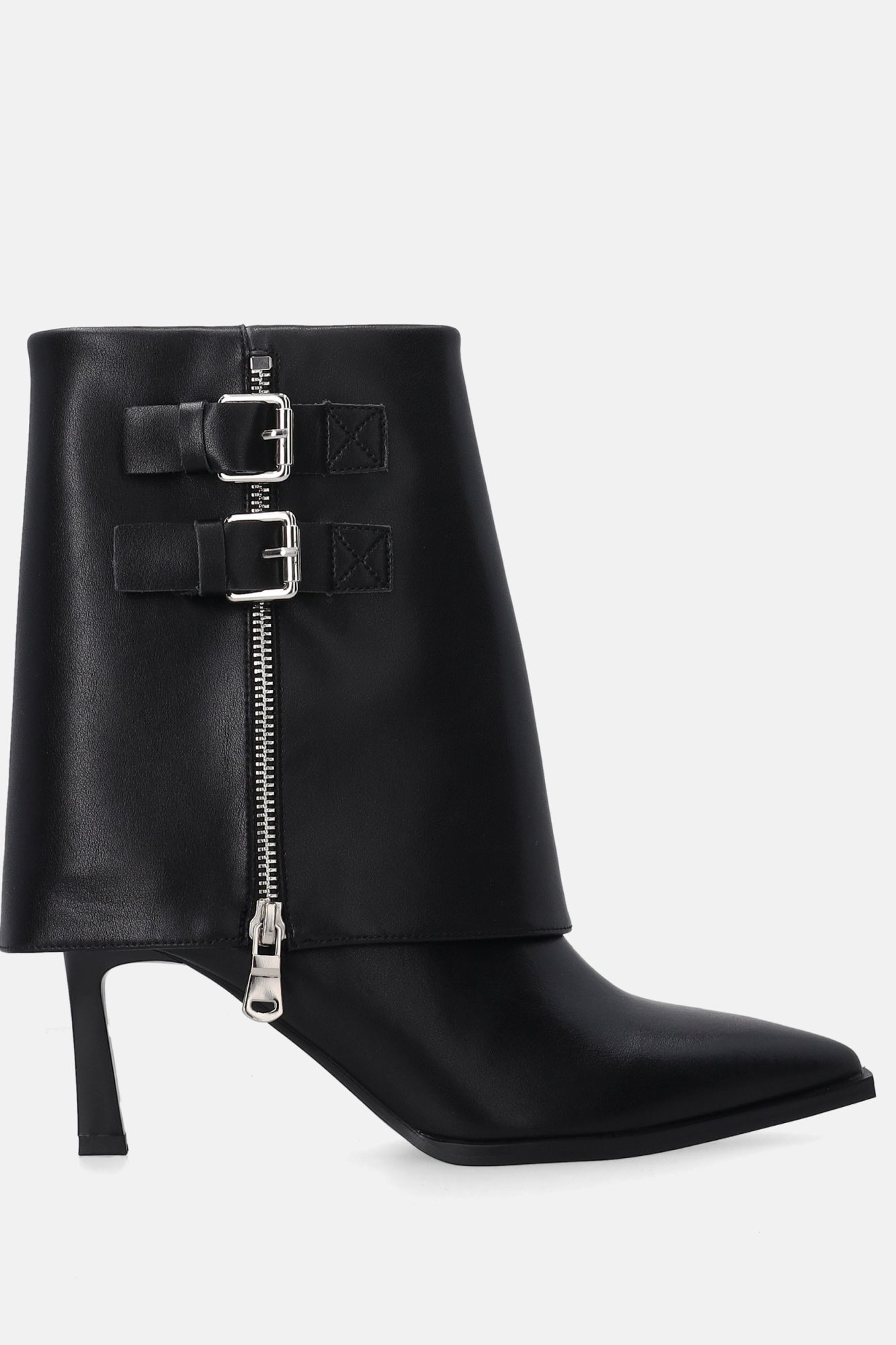Černé kotníkové boty na vysokém podpatku s ozdobným zipem a přezkami