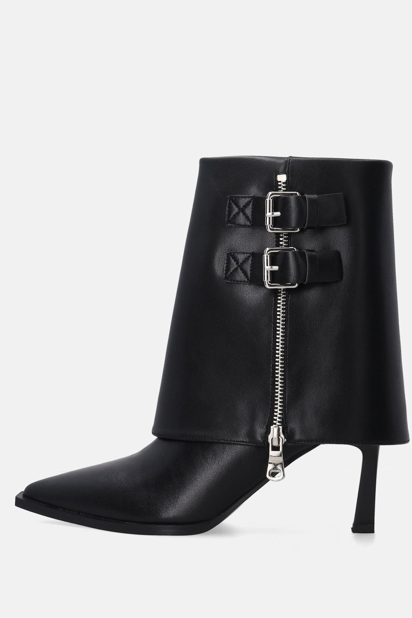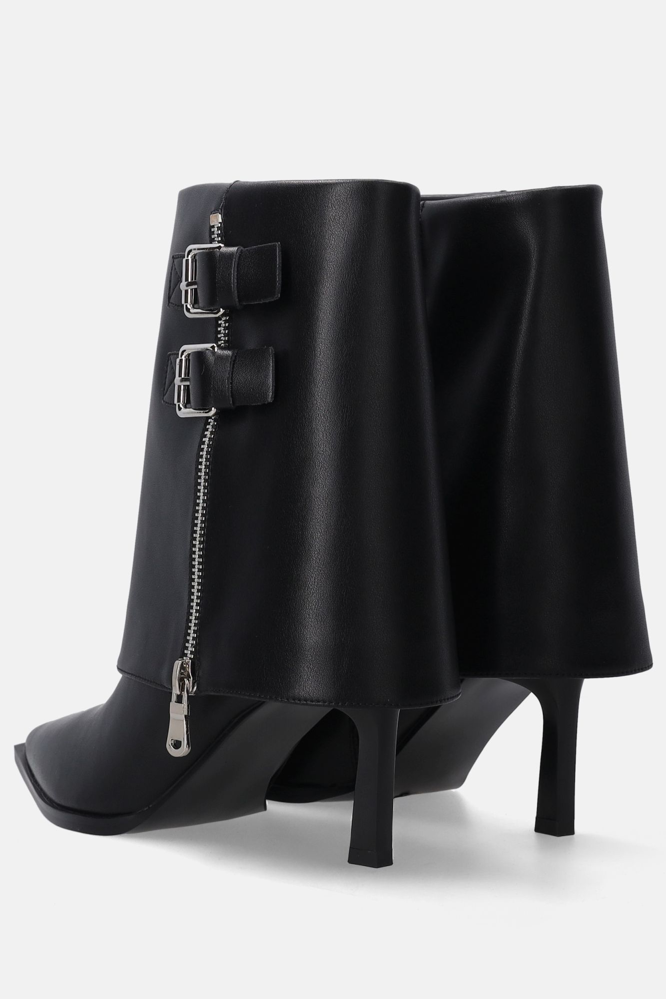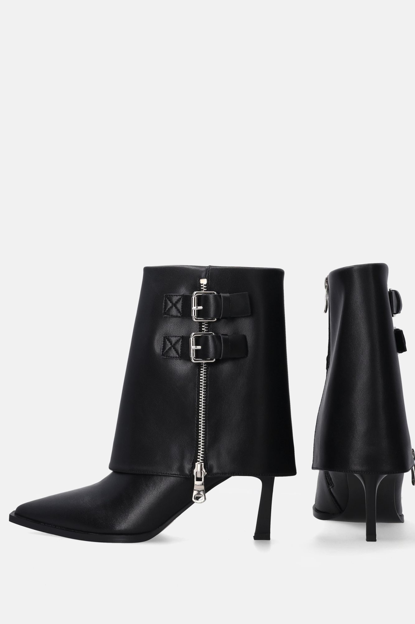 Černé kotníkové boty na vysokém podpatku s ozdobným zipem a přezkami